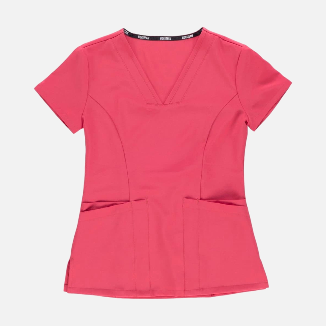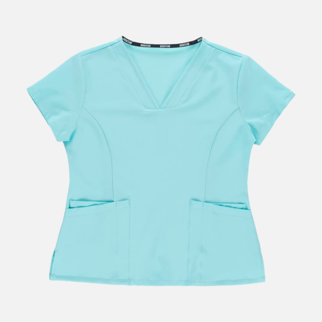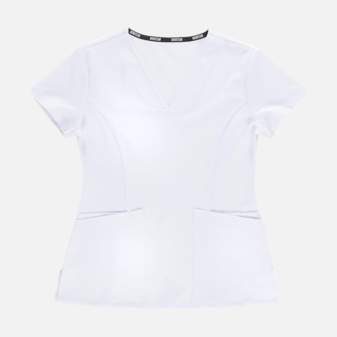 Túnica entalhada combinada, manga curta com tecido elástico. Gola a bico com biés combinado. Um bolso de chapa no peito. Um bolso para canetas. Aberturas nos laterais.