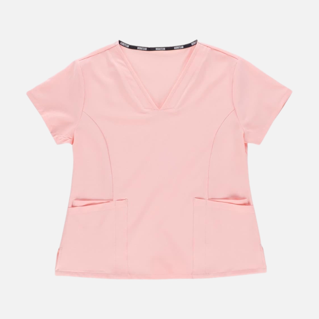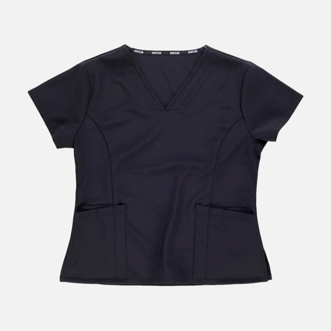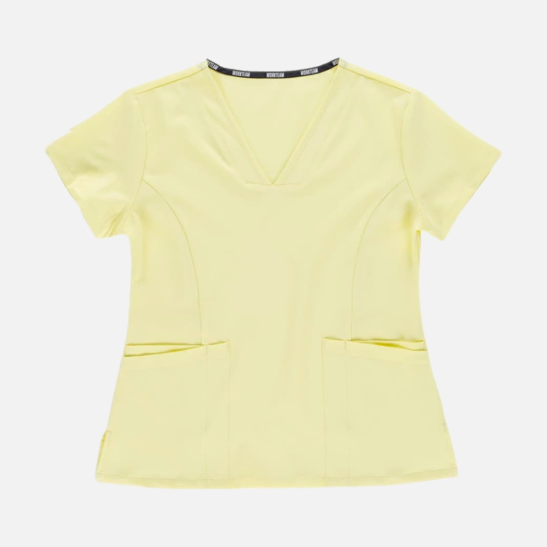 Túnica entalhada combinada, manga curta com tecido elástico. Gola a bico com biés combinado. Um bolso de chapa no peito. Um bolso para canetas. Aberturas nos laterais.