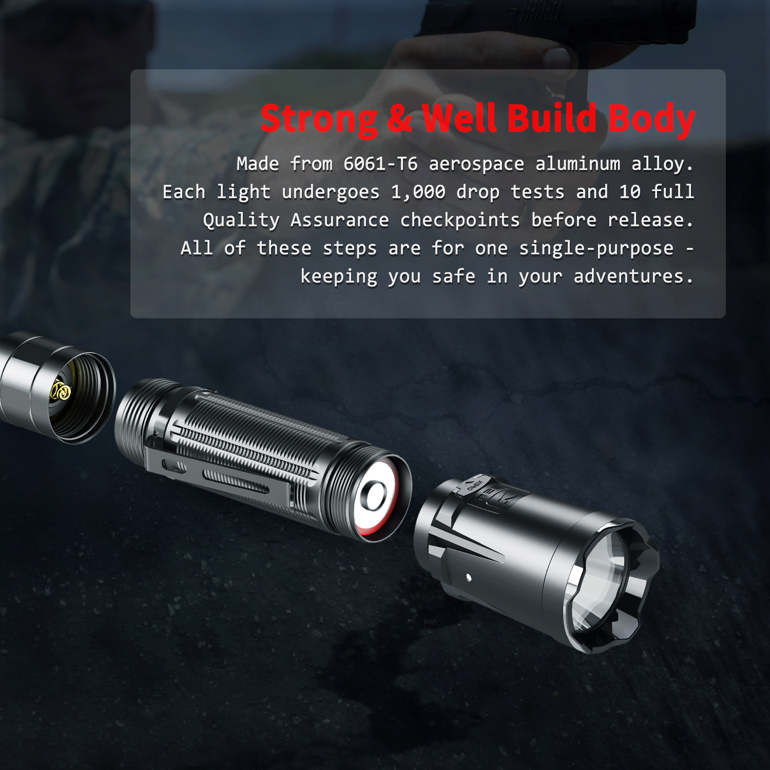 Tough for everything, made by 6061-T6 Aerospace Aluminum Alloy, military III hard anodic oxidation, 1 meter drop resistance, IPX8 waterproof.